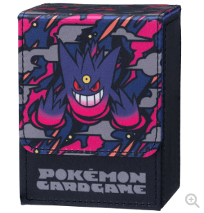 Estuche plegable para cartas del juego Pokémon Mega Gengar. Estuche plegable con un diseño de tela de base negra brillante y una sorprendente imagen de Mega Gengar. Tiene capacidad para 90 cartas con protector o 180 sin protector.